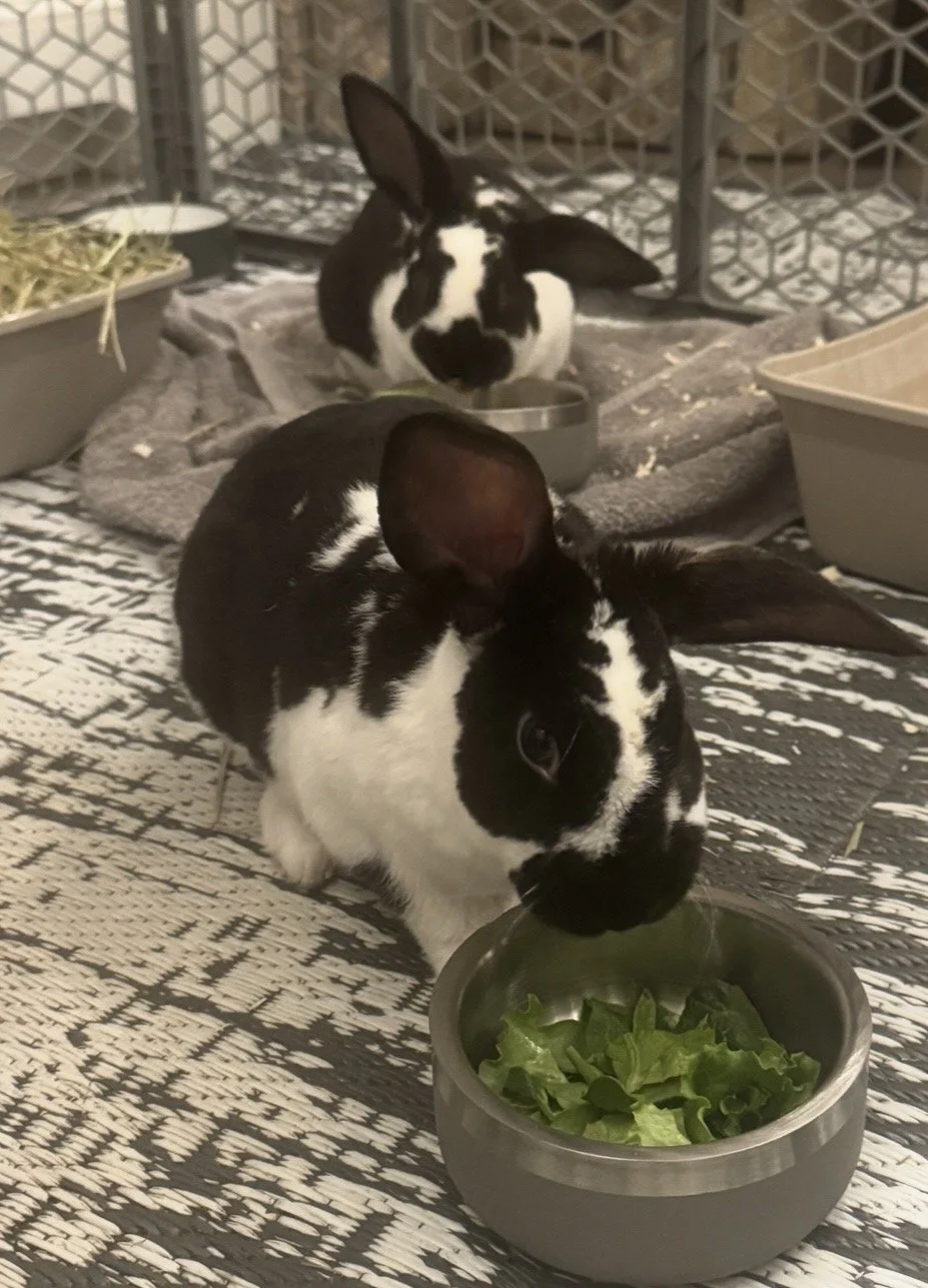 Meet Sprout and Bud, two ten-month-old male bunnies who were rescued on March 20th. Since we brought them home on the Vernal Equinox, we chose names inspired by the season of growth and new beginnings. The wide-striped bunny is named Sprout, as he was the first to come out and greet us at the rescue center and the first one to hop out of the carrier when we got to the Community Center. His brother named Bud, following close behind. Together Sprout and Bud felt like a fitting pairing that reflects both their personalities and the timing of their arrival.