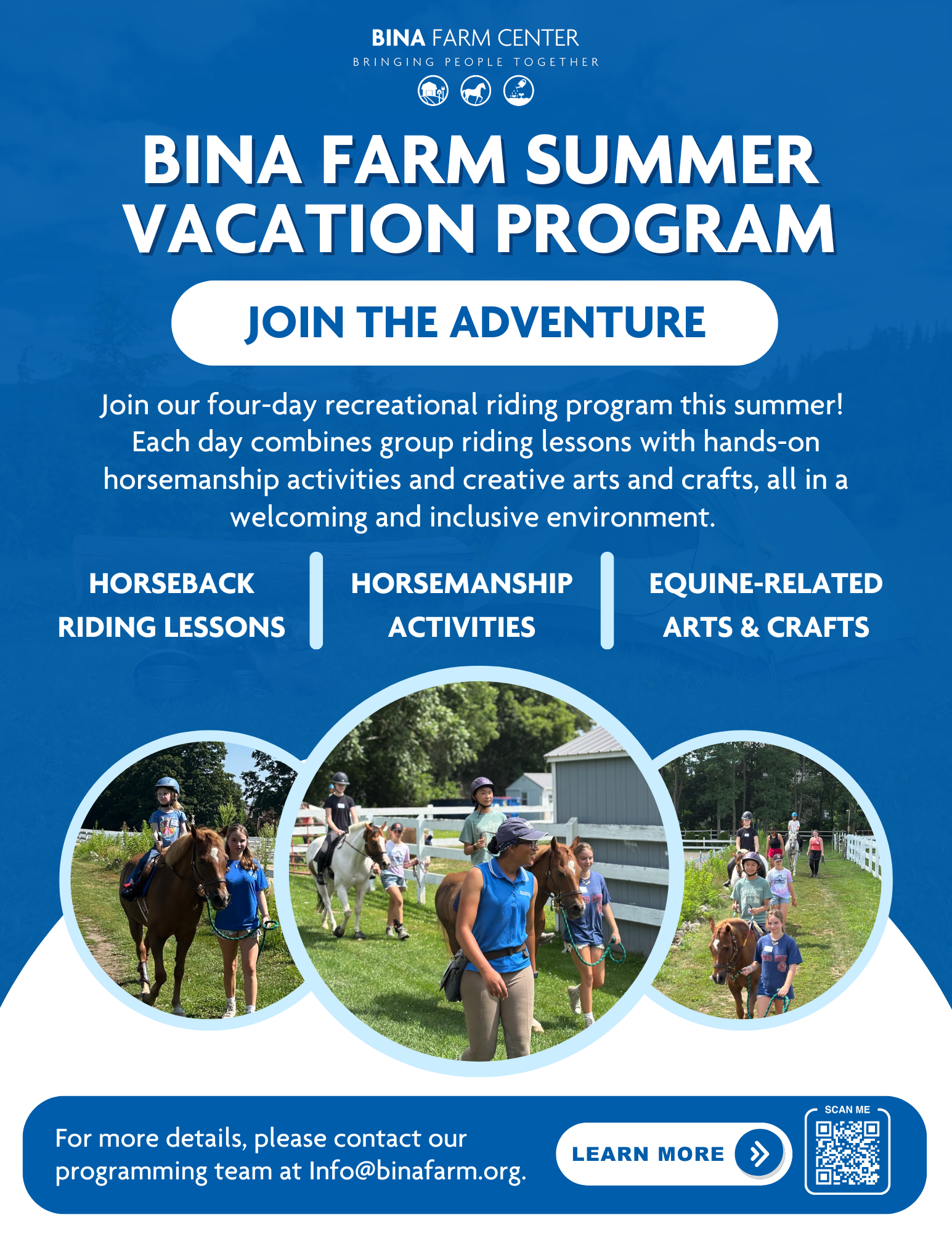 Follow us on social media or join our newsletter to receive updates when registration for the Summer Vacation Program opens. These programs fill up quickly, so we encourage families to register early. Please email info@binafarm.org for details.